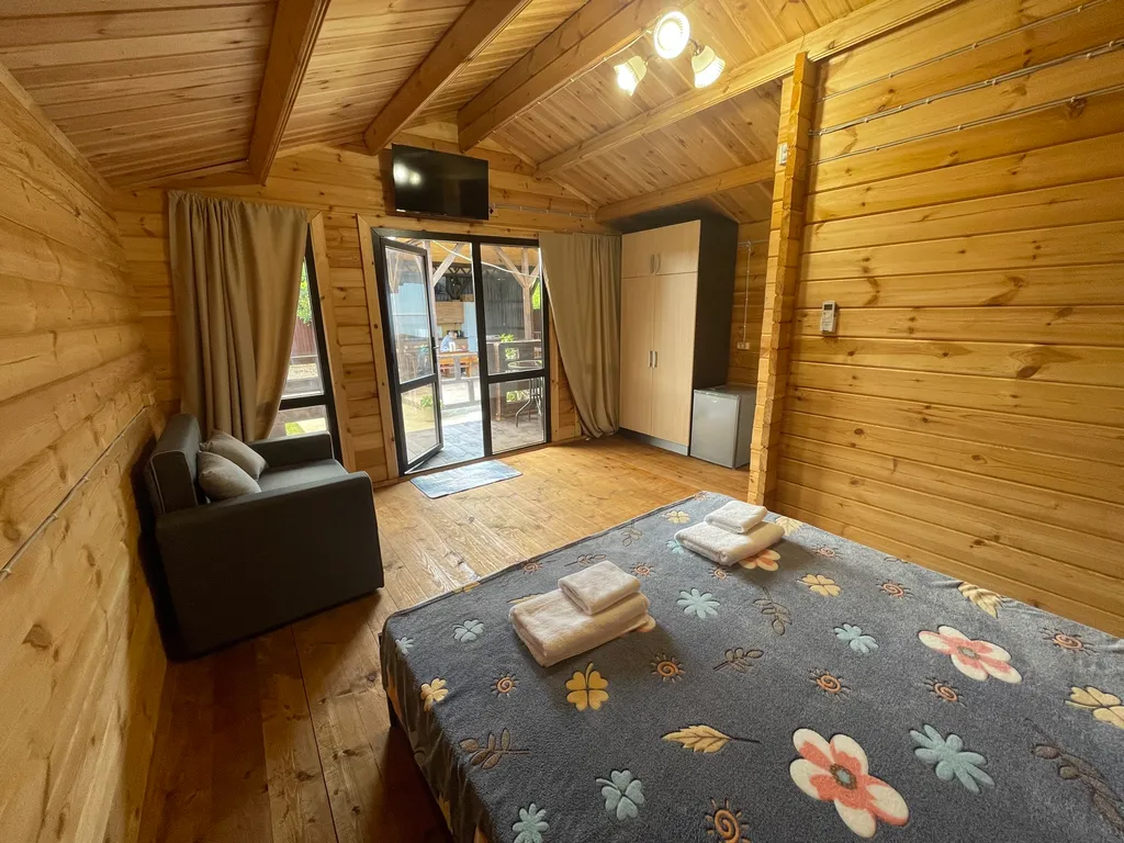 На территории нашего гостевого дома вас ждут шесть комфортабельных трёхместных домиков, каждый из которых оформлен с заботой о вашем комфорте. Просторные номера наполняют уютом и теплом, создавая атмосферу домашнего уюта.