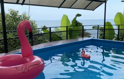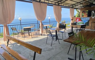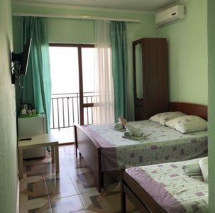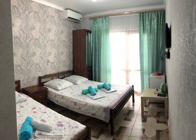 В гостевом доме все удобства в номере: сплит-система, телевизор, холодильник, душ, туалет, балкон видом на море, интернет, просторный двор, стоянка, бассейн, кухня со всем необходимым, а так же есть зона барбекю с видом на море и мангал общего пользования и детская площадка с батутом. На территории продаётся пицца, а так же домашняя выпечка и конечно же домашнее вино и чача. Так же мы организуем экскурсии с видеосъемкой: на Рицу, Афон, каньон, перевал, в Сухуми, в обезьяний питомник, по святым местам, вечерняя Гагра и многое другое.